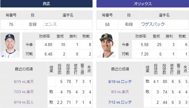 【試合実況】西武スタメン 先発:エンス(2023.8.22)
