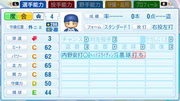 ミートE(47) パワーD(58) 走力A(85) 肩力A(82) 守備E(43) 捕球E(45)