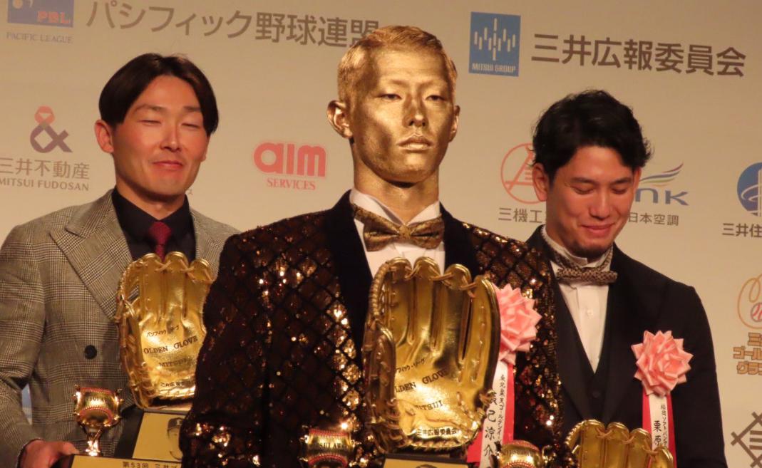 辰己は28日に都内で行われた三井ゴールデン・グラブ賞の表彰式に参加。4年連続4度目の受賞に、スパンコールを使用した金色のスーツを着用し、顔面から髪の毛、指先まで金色に染め上げて登場した。受賞者がステージ上に上がると、辰己の隣に立った西武源田、ソフトバンク周東は思わず苦笑いだった。