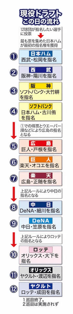 ◆現役ドラフト 日本プロ野球選手会の要望に日本野球機構(NPB)が応じ、約4年間の話し合いの末、22年12月から導入された。各球団は契約保留選手名簿の中から、外国人選手、複数年契約選手、FA資格選手、育成選手など8項目にあたる選手をのぞき、指名対象選手を2人以上(来季年俸5000万円以上1億円未満を1人含む場合は3人以上)を事前に提出。各球団は全体の対象選手リストの中から指名希望を議長に通知する。他球団からの希望をもっとも多く集めた球団が暫定指名順位1位となり、最初に指名する。指名された球団が次に指名する流れを基本とし、1巡目は必ず各球団1人が出て、1人が入る仕組みとなっている。希望した球団により、2巡目まで行われる。