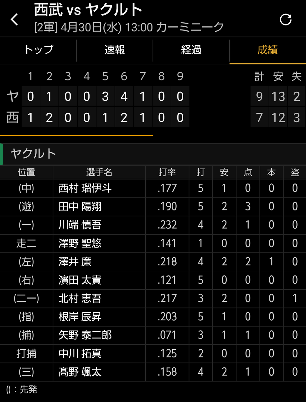 昨日のヤクルト戦は山野辺が最終打者だったのか